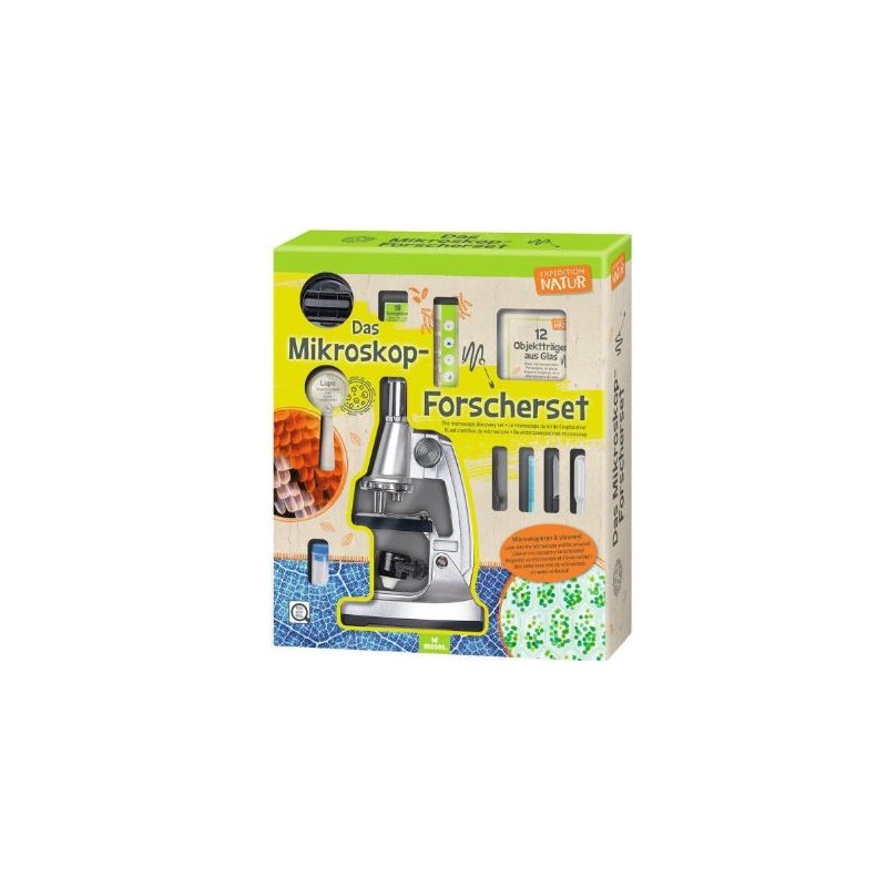Microscopio de alta calidad con aumento de 100x 400x y 900x. Amplio equipamiento adicional con un cortador de seguridad. Soportes resistentes y placas de cubierta de vidrio. Incluyeo instrucciones y experimentos para comenzar a investigar. Papel cuadriculado y papel secante incluidos.