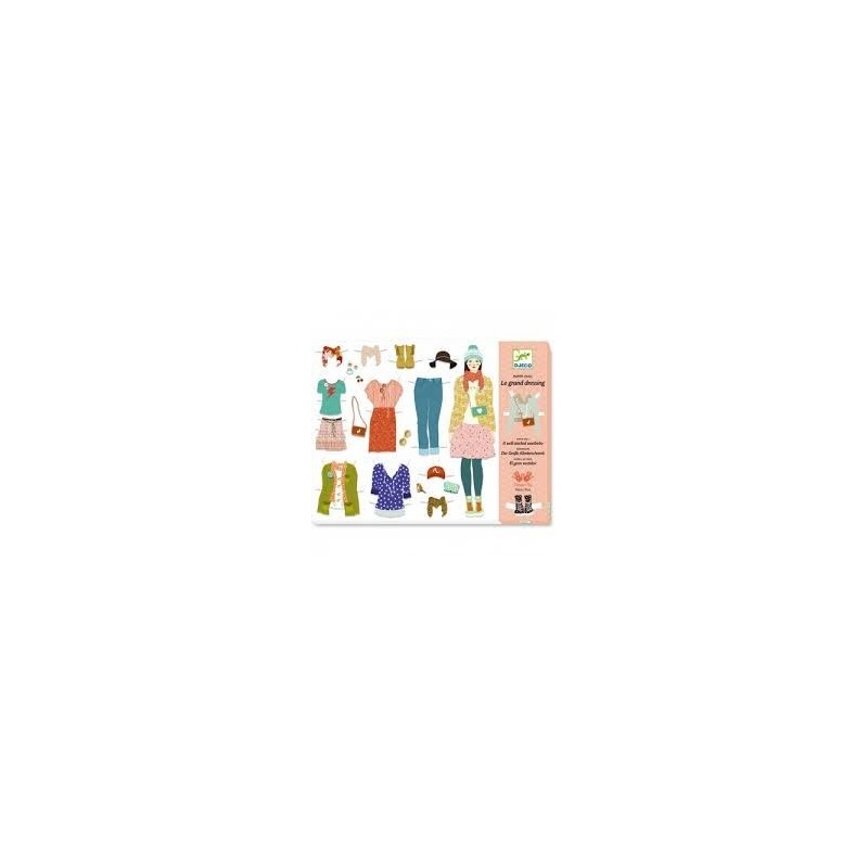 Contiene 3 jóvenes de cartón duro, vestidos, faldas, pantalones, camisas, chaquetas, bolsos de mano, sombreros, calzado, etc.