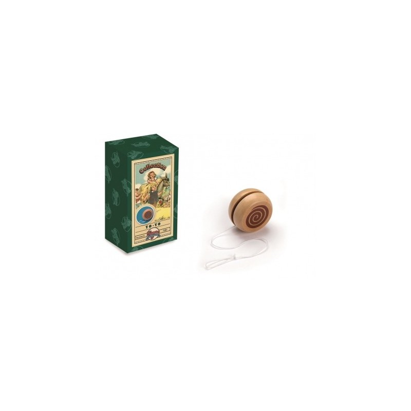 Tradicional juego del yo-yo de madera. Se trata de una pieza circular de madera con una ranura profunda en el centro en la cual se enrolla un cordón que, anudado a un dedo se hace subir y bajar alternativamente. Se maneja el disco mediante sacudidas hacia arriba y hacia abajo. Presentado en bolsa de tela y caja de cartón rígido de estilo retro.