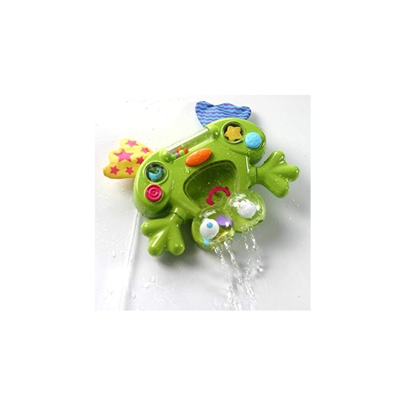 La rana está compuesta por una pala de agua desmontable y un colador; estrellas giratorias; pez flotante; ojos temblorosos, delfines giratorios y ventosas giratorias para facilitar el drenaje.