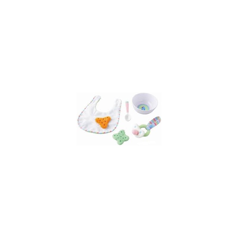 Set de inicio que consta de un babero, tetina, tazón, cuchara y manchas que se pueden pegar. El babero es de doble cara y se puede unir con velcro.