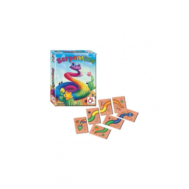 Serpentina es un juego de mesa para niños, en el que tendréis que crear serpientes, ¡y cuanto más grandes mejor!, fijándoos en los colores. A modo dominó, tendréis que ir enlazando las cartas, haciendo coincidir los colores que tiene la serpiente de la mesa con la carta que saquéis del mazo en vuestro turno