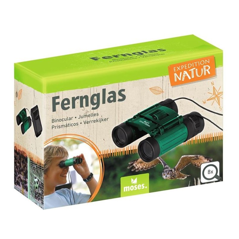 Lente 8 x 21mm. Superficie de goma antideslizante. Incluye bolsa con cinturón y cinta para el cuello.