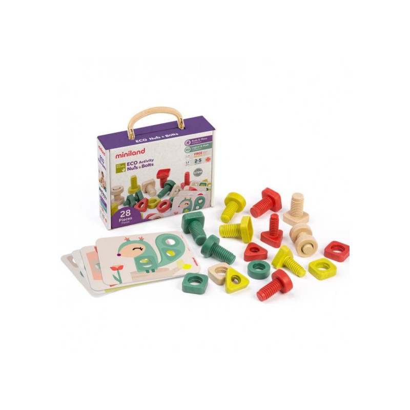 Set de tornillos y tuercas de gran tamaño, con las tres formas geométricas básicas: círculo, cuadrado y triángulo. Potencian la destreza manual y la coordinación viso motora mediante la acción de enroscar y desenroscar.