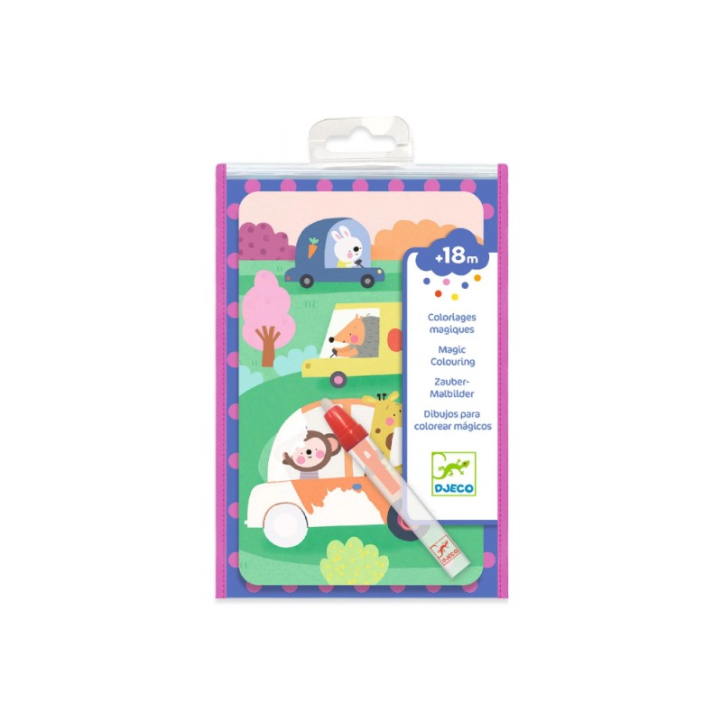 Manualidad que realiza un efecto mágico cuando pasamos el rotulador por encima de la lámina. El tema de esta manualidad son los vehiculos en la carretera.Se puede volver a empezar tantas veces como se quiera.Contiene bandeja rígida para apoyar las 2 tablas.A partir de los 18 meses.