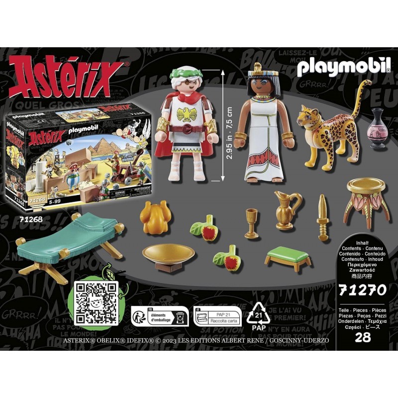 Con este set de Astérix los pequeños podrán recrear las escenas de César y Cleopatra. Incluye dos figuras, leopardo, sillón, mesa, jarrón, jarra, y más accesorios.