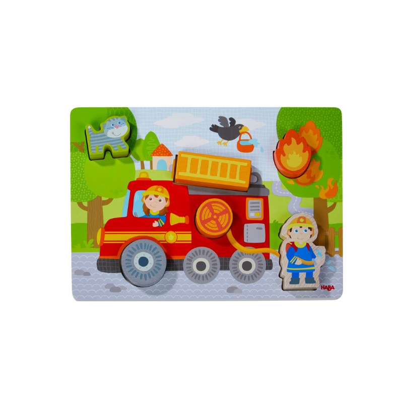 Haba Puzzle con forma de camión de bomberos ¡Ta-tu, ta-tu, aquí viene el camión de bomberos! Un gato está atrapado en un árbol, otro árbol se ha incendiado. ¿Quién puede desconcertar bien y ayudar a los bomberos? Las grandes piezas del puzzle son fáciles de agarrar para los niños pequeños. Un rompecabezas de madera diseñado con cariño que es divertido y fomenta la motricidad fina. Especificaciones