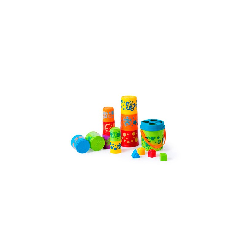 Apilable gigante, de 95 cm. de altura formado por 10 vasitos de tamaño progresivo. A los pequeños les encantará ordenar en vertical y apilar para posteriormente derribar, que será lo que más les divierta. Se pueden guardar todas las piezas en el cubo grande con asa, ocupando muy poco espacio, guardar también ayudará a comprender los conceptos ”grande-pequeño”.