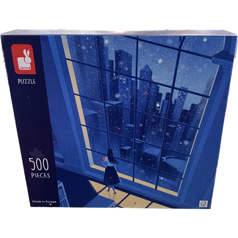 Los rompecabezas artísticos Vista nocturna en azul de la marca francesa JANOD constan de 500 elementos que, cuando se organizan, crean hermosos gráficos de pintura: una vista desde la enorme ventana de la biblioteca de una ciudad invernal nocturna en tonos azules con una niña mirándolos, sosteniendo un libro rojo en la mano. La ilustración terminada tiene unas dimensiones de 48 x 34 cm, y cuando está enmarcada, puede ser una decoración encantadora de la habitación de los niños u otro lugar de la casa. Sobre todo porque el tema, los colores y el diseño se adaptan perfectamente a las últimas tendencias en diseño de interiores.